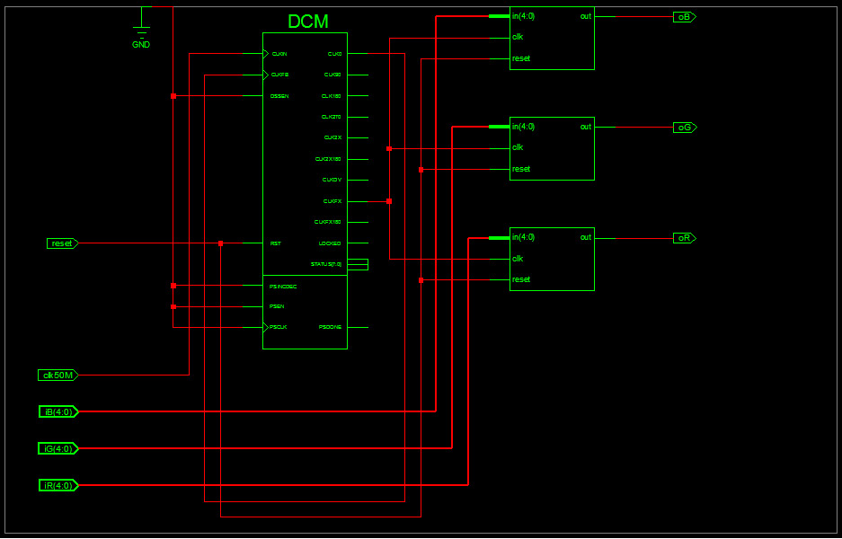 R/G/B の3つのDACのクロックとして DCMからの出力をつなぎ、リセットもつなぎます。